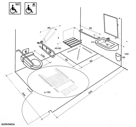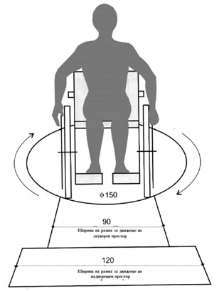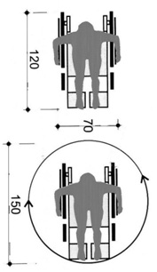 Просечна димензија на инвалидски колички е 70 х 120 цм, додека за нивно вртење во круг е потребен простор со дијаметар од 150цм. Висина која максимално може да ја допре лице во инвалидска количка е 180м, додека ширина 60цм.