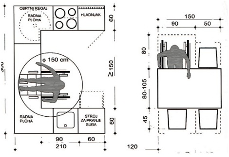 Растојанието во кујната помеѓу елементите треба да биде најмалку во дијаметар од 150 цм, со што ќе се осигура вртењето на инвалидската количка и со тоа користење на кујната. Работната плотна се изведува конзолно до најмала долна висина од 70 цм и горна со најмногу 85 цм и длабочина од 60 цм. Горните висечки елементи се поставуваат со долниот раб на 120 цм. Масата за јадење мора да биде долг 150 цм, како би се овозможила површина од 90 цм за лицето во инвалидска количка.